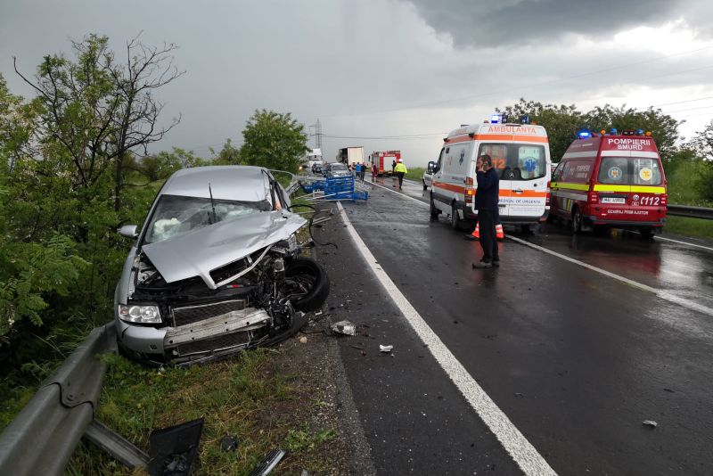 Accident la patru maşini! Ca şi cum asta nu ar fi fost de ajuns, încărcătura din TIR s-a împrăştiat pe şosea, o grămadă de profile metalice ocupând benzile de mers. Un autovehicul înmatriculat în Ucraina, în care erau cinci pasageri, a lovit în plin grămada. Un alt autovehicul a lovit maşina ucrainienilor.Citeşte şi: https://realitateadearges.net/a-fost-furata-in-timp-ce-cobora-din-microbuz-dar-s-a-impacat-cu-hotul/Trei ambulanţe, un echipaj de pompieri şi unul de poliţie s-au deplasat la locul accidentului. Traficul a fost blocat în ambele sensuri, vreme de o oră. Două persoane din maşina lovită frontal, de TIR au fost rănite. Acestea au fost transportate la Spitalul Judeţean de Urgenţă Piteşti. Ceilalţi pasageri din maşinile implicate au scăpat nevătămaţi. Şoferul inconştient este cercetat penal pentru vătămare corporală din culpă.Foto: ISU Argeş, Info Trafic Piteşti