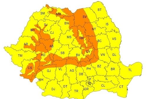 Meteorologii au emis atenționări cod galben și portocaliu, iar prima avertizare va fi în vigoare de joi, de la ora 22.00, până vineri, la ora 12.