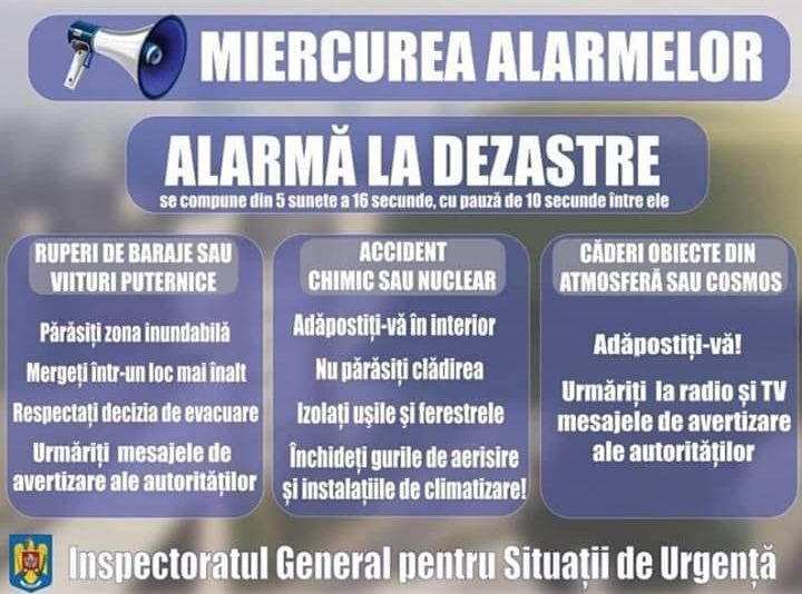 Astăzi, exercițiu de alarmare la dezastre! Sirele vor suna din nou aşa cum ne-au obişnuit. Proiectul "Miercurea Alarmelor"a fost lansat încă din 2017. Aşadar, fiind miercuri, la ora 10.00 sirenele din întreg judeţul vor suna. Cetăţenii nu trebuie să intre în panică fiind vorba doar de o simulare.Sirenele din țară vor emite semnalul „Alarmă la dezastre”, care are rolul de prevenire a populației civile asupra apariției pericolului.