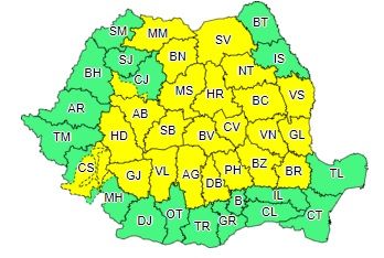 În Muntenia și în sud-vestul Moldovei vor fi perioade cu instabilitate atmosferică accentuată ce se va manifesta prin averse cu caracter torențial, frecvente descărcări electrice, intensificări de scurtă durată ale vântului, vijelii și pe arii restrânse grindină. În intervale scurte de timp sau prin acumulare, cantitățile de apă vor depăși 20...25 l/mp și izolat 40 l/mp.