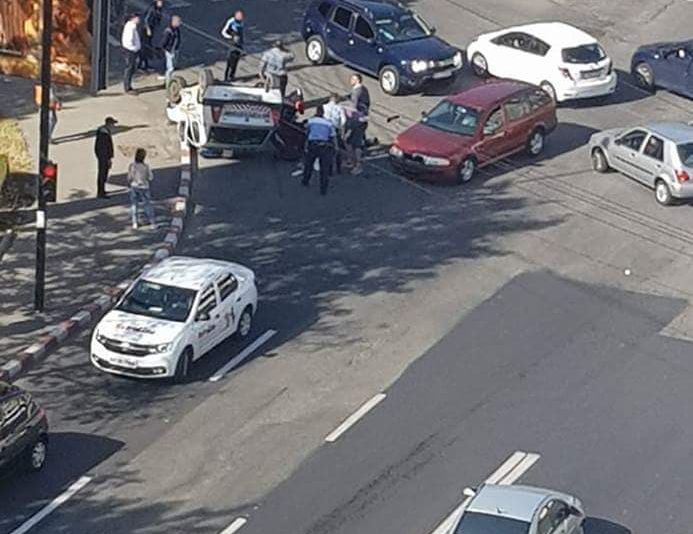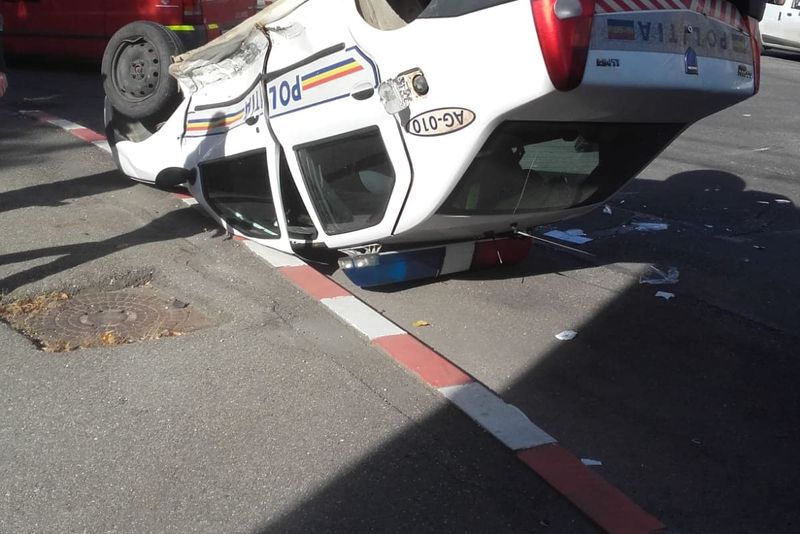 Joi după-amiază, un echipaj de poliţie răsturnat în intersecţia de lângă fostul sediul CEZ, din Piteşti. Oamenii legii de la Secţia Rurală Albota, ar fi trebuit să ajungă la IPJ Argeş. Aveau semnalele acustice şi luminoase pornite.