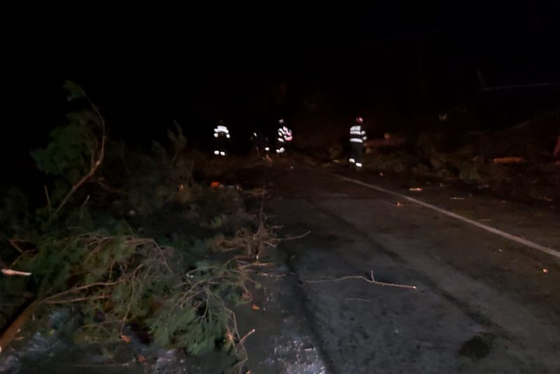 La Cetățeni, DN 72 A este blocat de copaci și pietre căzute pe șosea.
