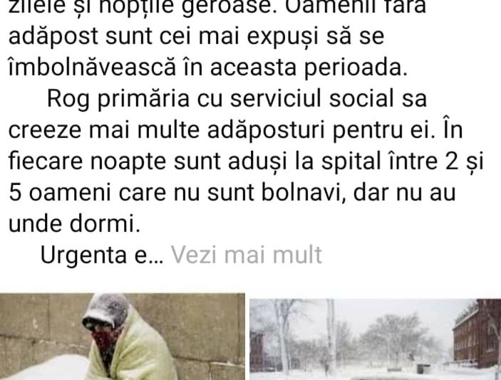 Ei vin adesea murdari, nemâncați, dar băuți, uneori puși pe ceartă. Credeți că Urgenţa poate fi transformată în adăpost de noapte sau în azil pentru ei?Este momentul să fie ajutați de primărie măcar cu un pat unde sa se odihnească și o masa caldă. Probabil ca exista în derulare programe pentru ei, dar nu este destul” este mesajul transmis de Alina Mărtău.Reacţiile nu au întârziat să apară, postarea adunând mai multe comentarii de la oameni care vin cu diverse propuneri. Una dintre acestea se referă la faptul că şi Biserica ar trebui să se implice mai mult în aceste programe sociale.