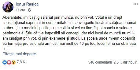 „Aberantule, îmi câștig salariul prin muncă, nu prin vot. Votul e un drept constituțional exprimat în conformitate cu convingerile fiecărui cetățean, numai o aberație a mediului politic, cum ești tu și cei ca tine, îi pot asocia o valoare patrimonială. Știu că ți-e imposibil să concepi, dar nici locul de muncă nu mi l-am câștigat prin vot, ci prin examene și studii.