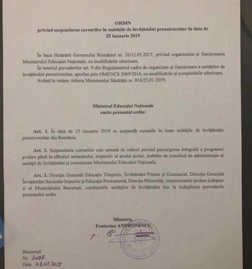 Școli închise vineri 25 ianuarie 2019. Un Ordin de ministru a fost semnat miercuri de către ministrul Educaţiei, Ecaterina Andronescu. Acesta prevede suspendarea integrală a cursurilor în sistemul de învăţământ preuniversitar.Decizia a fost luată în urma solicitărilor făcute de Ministerul Sănătății.De asemenea, elevii nu merg la școală nici joi, 24 ianuarie 2019, de Mica Unire.
