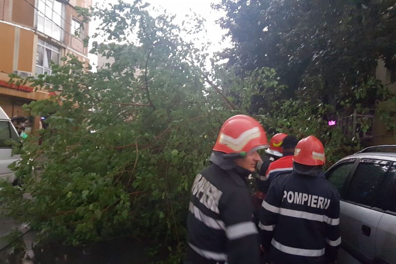 Copac doborât de o furtună care s-a abătut asupra Piteștiului, duminică seară. Arborele s-a prăbușit din cauza vântului puternic peste două mașini, provocând avarii. Vijelia a fost însoțită și de grindină.