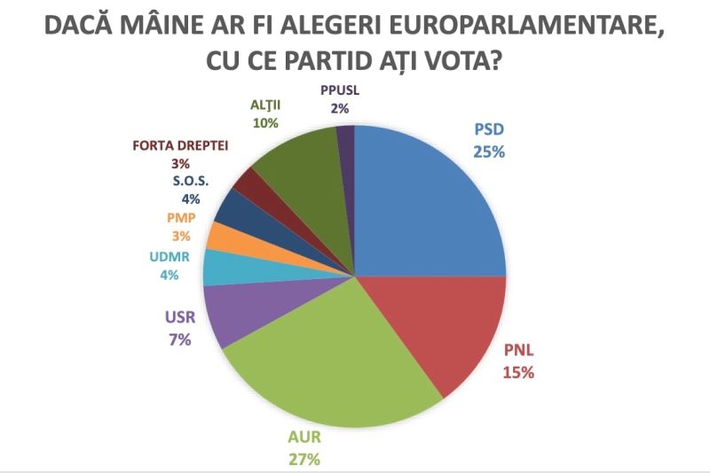 Încrederea românilor în actuala coaliție scade, se pare, de la o zi la alta. Dacă până acum bătălia se dădea între PSD și PNL, iată că, potrivit celui mai nou sondaj INSOMAR, în grațiile românilor a intrat AUR, partidul lui George Simion: 27% dintre respondenți îl dau câștigător la europarlamentare. Îl urmează PSD, cu 25%, și PNL, cu doar 15 procente.
