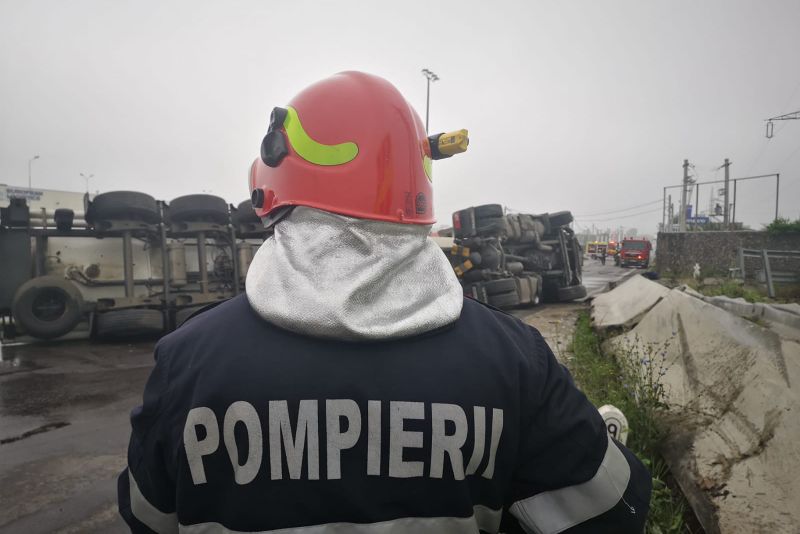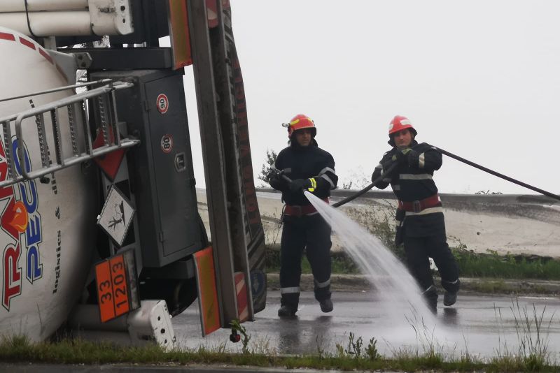 Pompierii argeșeni intervin cu 2 autospeciale de stingere, două autospeciale de descarcerare, autospeciala CBRN și o ambulanță SMURD la ieșirea de pe A1, la Bascov, unde o cisternă plină cu benzină și motorină s-a răsturnat. Șoferul a pierdut controlul volanului în curbă iar autovehiculul este răsturnat pe-o parte, pe șosea. Nu sunt victime.Cisterna este încărcată cu 33 de tone de combustibil, 20 de tone de benzină și 13 de motorină. Sunt scurgeri de benzină, pompierii încercând să oprească împrăștierea combustibilului pe carosabil.