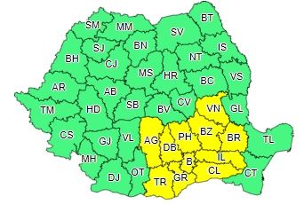 În Muntenia și în sud-vestul Moldovei vor fi perioade cu instabilitate atmosferică accentuată ce se va manifesta prin averse cu caracter torențial, frecvente descărcări electrice, intensificări de scurtă durată ale vântului, vijelii și pe arii restrânse grindină. În intervale scurte de timp sau prin acumulare, cantitățile de apă vor depăși 20...25 l/mp și izolat 40 l/mp.