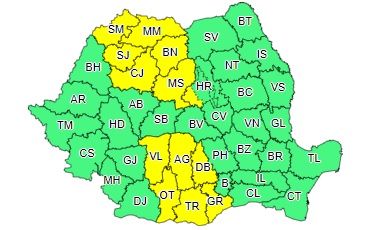 Potrivit ANM, în Maramureș, Satu-Mare, Sălaj, Cluj, Bistrița-Năsăud, Mureș, Vâlcea, Argeș, Dâmbovița, Olt, Teleorman, Giurgiu și local în Harghita vor fi perioade cu instabilitate atmosferică accentuată ce se va manifesta prin averse torențiale, frecvente descărcări electrice, grindină și vijelii. Cantitățile de apă vor depăși 25 l/mp și izolat 40...50 l/mp.Atenţionarea intră în vigoare astăzi la ora 14:00 şi este valabilă până la ora 22:00.De asemenea, de astăzi, de la ora 11.00, este în vigoare şi o informare meteorologică care vizează cea mai mare parte a ţării. Potrivit informării, până vineri dimineaţa, la ora 10, vremea va fi în general instabilă.Local și temporar vor fi averse, descărcări electrice, intensificări de scurtă durată ale vântului și izolat grindină. Cantitățile de apă vor depăși, în perioade scurte de timp sau prin acumulare, 15...25 l/mp și pe arii restrânse 35 l/mp.