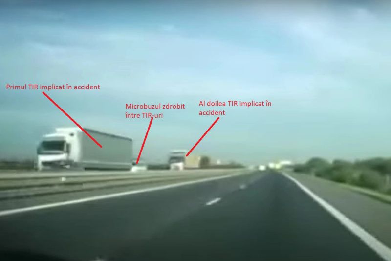Potrivit unei înregistrări video postate pe YouTube, șoferul TIR-ului galben a încercat să depășească trei autoturisme din față, printre care și un camion. În momentul în care a încercat depășirea, a intrat în mașina albastră, pe care a proiectat-o pe banda de urgență.