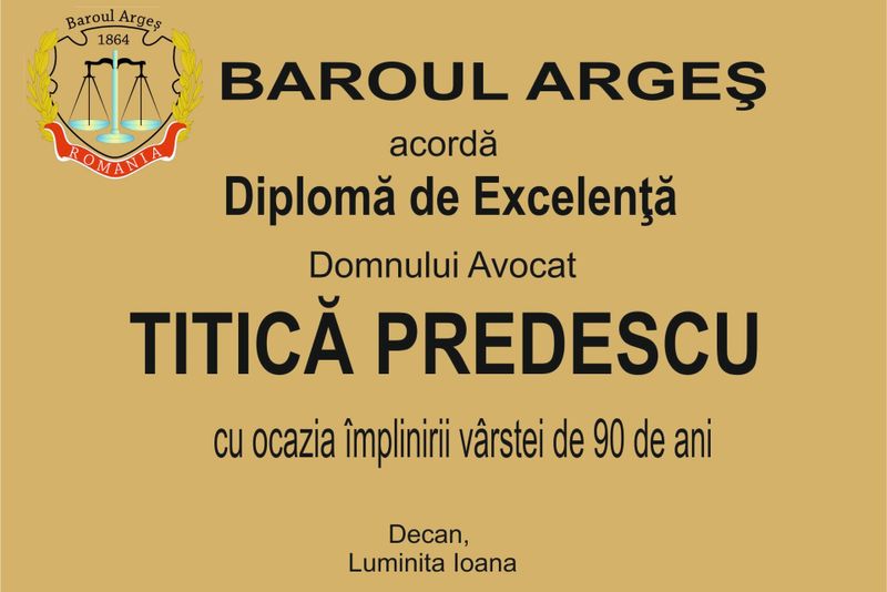 Doliu la Baroul Argeş! A murit un maestru al apărării în faţa instanţelor, Titică Predescu. Avocaţii din Argeş îi aduc un ultim omagiu celui care de-a lungul timpului a fost un formator redutabil. Titică Predescu s-a născut pe 2 iunie 1928, în comuna Schitu, judeţul Olt. A absolvit Facultatea de Drept din Bucureşti în anul 1951, fiind repartizat ca stagiar, în judeţul Olt. Şase luni mai târziu, a fost transferat la Colegiul de Avocaţi Argeş (n.r Baroul Argeş) unde a rămas până la retragerea din activitate.