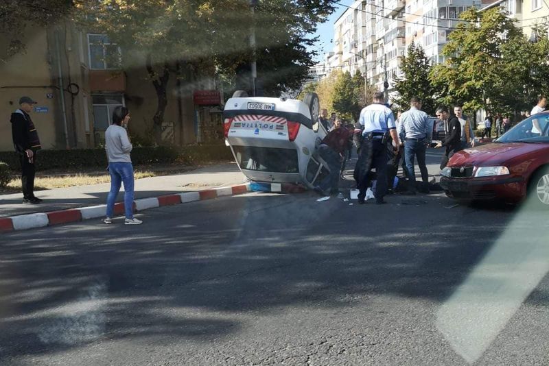 Echipaj de poliţie răsturnat! Unul dintre agenţi e rănit, fiind dus la spital