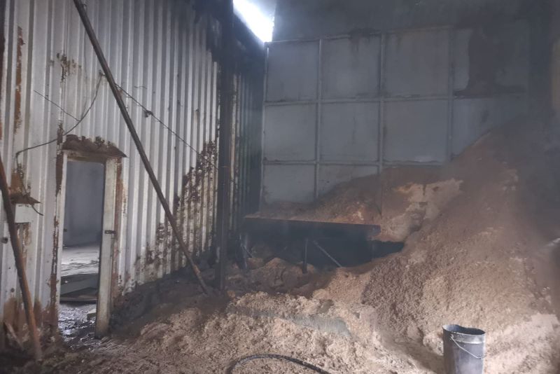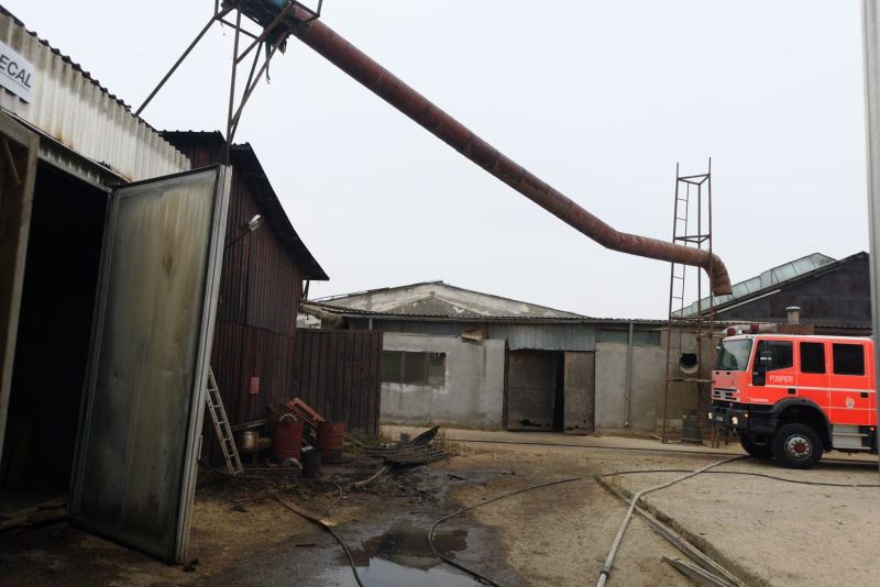 Ardea în camera centralei, acolo unde se află şi o cantitate mare de rumeguş. Sunt mai multe focare aprinse în talaş. Intervenţia este una dificilă, având în vedere că rumeguşul trebuie luat la lopată şi fiecare este udată pentru a fi stins. La această oră focarele nu au fost stinse.Cauza incendiului nu a fost stabilită.