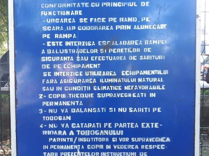 Panoul cu pricina este instalat în parcul din centrul Piteștiului, la locul de joacă pentru copii, din Parcul 1907. Reprezentanții Administrației Domenilului Public Pitești au scris cu litere de-o șchioapă cum ar trebui să se comporte copiii de peste 3 ani ce au voie și ce le este interzis atunci când sunt în parc.Numere de urgență greșite sunt adăugate după o serie de sfaturi, unele, hilare, altele, necesare: "Echipamentul se poate utiliza numai în conformitate cu principiul de funcționare. Urcarea se face pe rând, pe rampă, iar coborârea prin alunecare, pe rampă.Se interzice utilizarea echipamentului fără asigurarea iluminatului natural sau în condiții climatice nefavorabile (n.r dacă se întunecă sau plouă, nu ai voie în parcul de joacă). Copiii trebuie supravegheaţi în permanenţă. Nu vă balansaţi şi nu săriţi pe tobogan, nu vă căţăraţi pe partea exterioară a toboganului...", scrie pe panou.