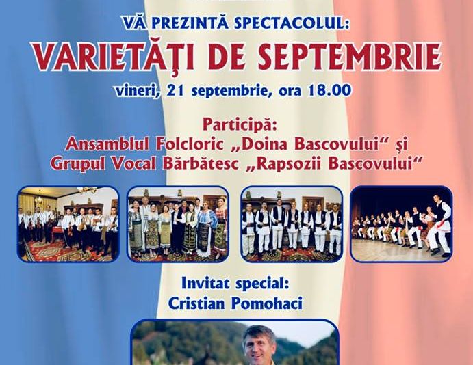 Pomohaci, este invitat special avându-i colegi de scenă pe toată durata spectacolului pe artiştii locali de la Ansamblul Folcloric "Doina Bascovului" şi Grupul Vocal Bărbătesc" Rapsozii Bascovului". Spectacolul va avea loc pe 21 septembrie, la ora 18.00, intrarea fiind liberă.Spectacolul "Varietăţi de Septembrie" este organizat de Casa de Cultură, în colaborare cu Consiliul Local Bascov şi Primăria Bascov, făcând parte din manifestările dedicate Centenarului 100 România.Ultimul spectacol susţinut de Cristian Pomohaci, în Argeş a fost în luna mai, atunci când artistul a fost invitat să cânte la Ziua Comunei Lereşti.