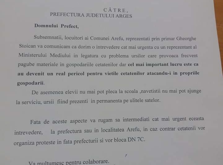 De asemenea elevii nu mai pot pleca la şcoală, navetiştii nu mai pot ajunge la serviciu, urşii fiind prezenţi pe uileţele satelor. Faţă de aceste aspecte vă rugăm să intermediaţi cât mai urgent această întrevedere, la Prefectură sau în localitatea Arefu. În caz contrar, cetăţenii vor organiza proteste în faţa Prefecturii şi vor bloca DN 7 C".Urşii din comuna Arfeu şi nu numai, au creat multe probleme. Au atacat gospodării şi oamnei. Aceştia nu se mai tem şi ies la şosea, fiind văzuţi zilnic pe Transfăgărăşan. Urşii sunt motivul care a determinat închiderea Cetăţii Poenari, unul dintre cel mai importante obiective turistice din Argeş
