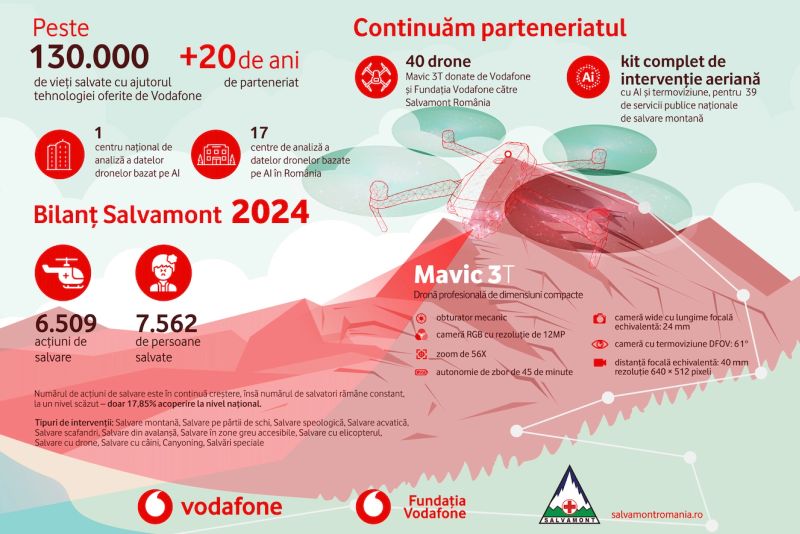 Vodafone și Fundația Vodafone continuă parteneriatul de peste 20 de ani cu Salvamont România și echipează fiecare serviciu public județean și local, precum și noile autospeciale de intervenție, cu drone profesionale de căutare și salvare, dotate cu tehnologie AI și termoviziune.
